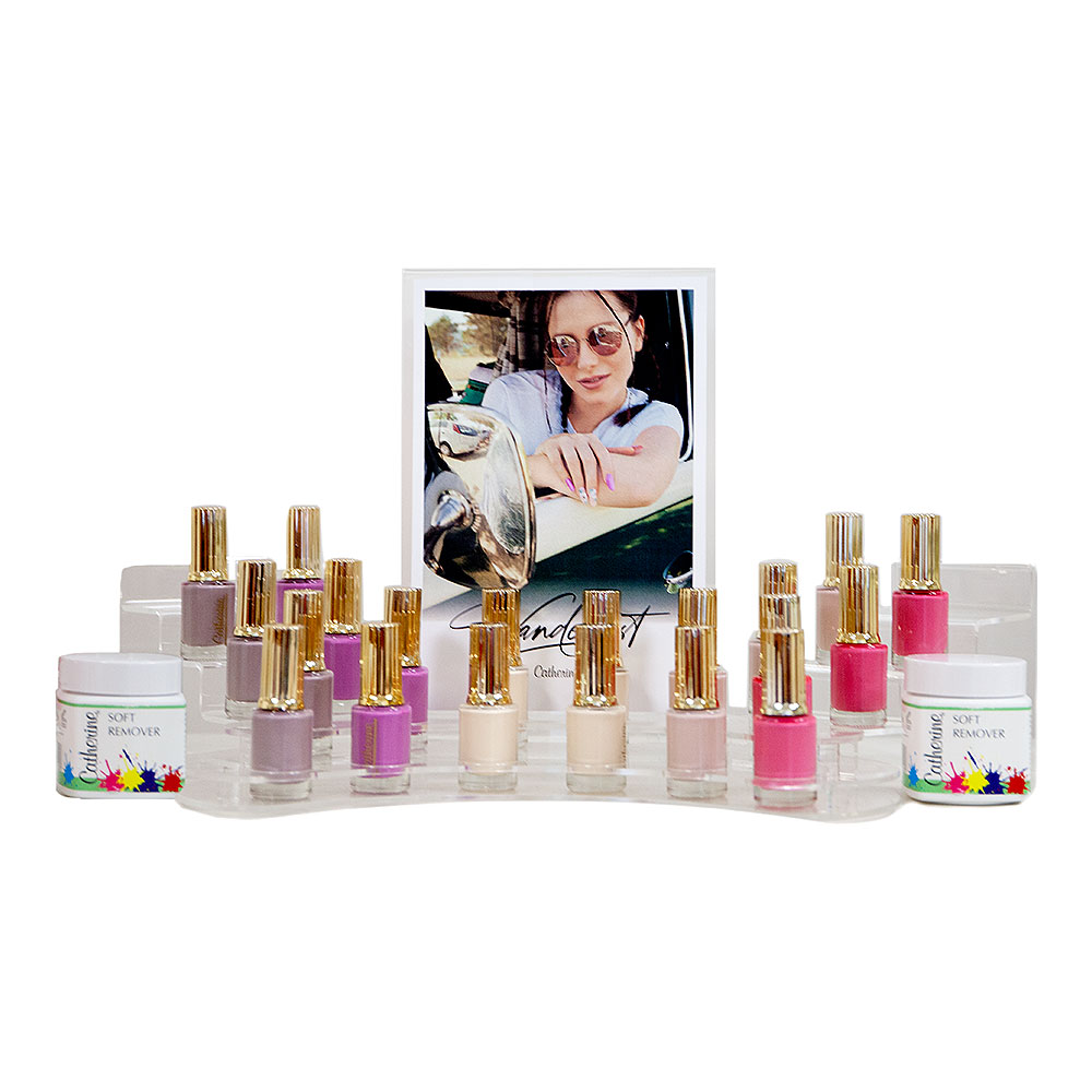 Dekoracní propagacní prodejní stojan Classic Lac Wanderlust obsahuje 3 x klasický lak od každé barvy 11 ml + ZDARMA: 1 tester na barvu á 11 ml, 2 x Soft Remover Box, prodejní stojan + displej