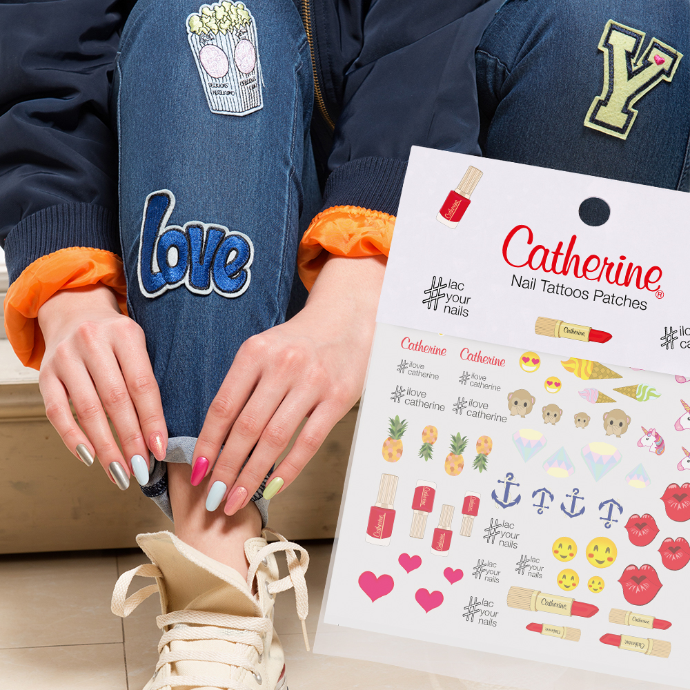 Nail Tattoos mit lustigen Patches & Emojis. Passend zum Print Shirt Patches. Get the Catherine Style!