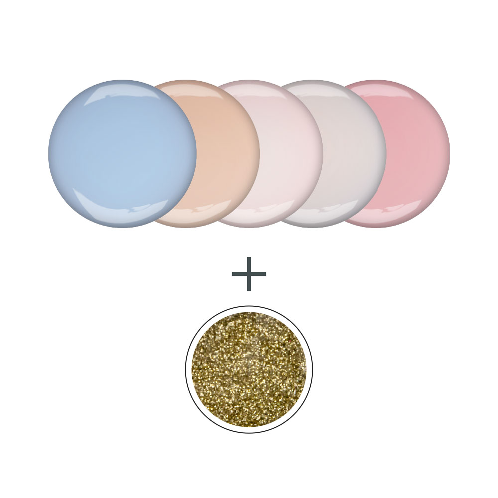 5 x UV/LED nail polish + à 5 g / 4,5 ml / 0,16 fl.oz. + GRATIS: Bio Glitter gold: Entdeckt die Magie unserer neuen Whisper Box! - Die Box besteht aus den fünf unwiderstehlichen UV-Nailpolish-Farben: Sky Dance, Aurora Sand, Soft Bloom, Creamy Cloud und Mocha Moonstone. Lasst euch von jeder neuen Nuance inspirieren und bringt ein Flüstern von Farbe in euren Alltag!