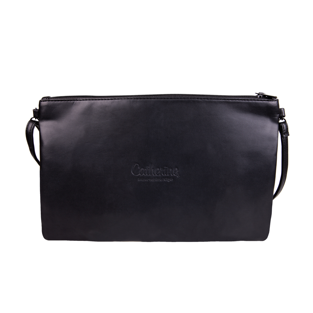 Schwarze Tasche mit Prägung und Catherine Logo. Größe: 28 x 17 cm, Gurtlänge: 1,20 m.