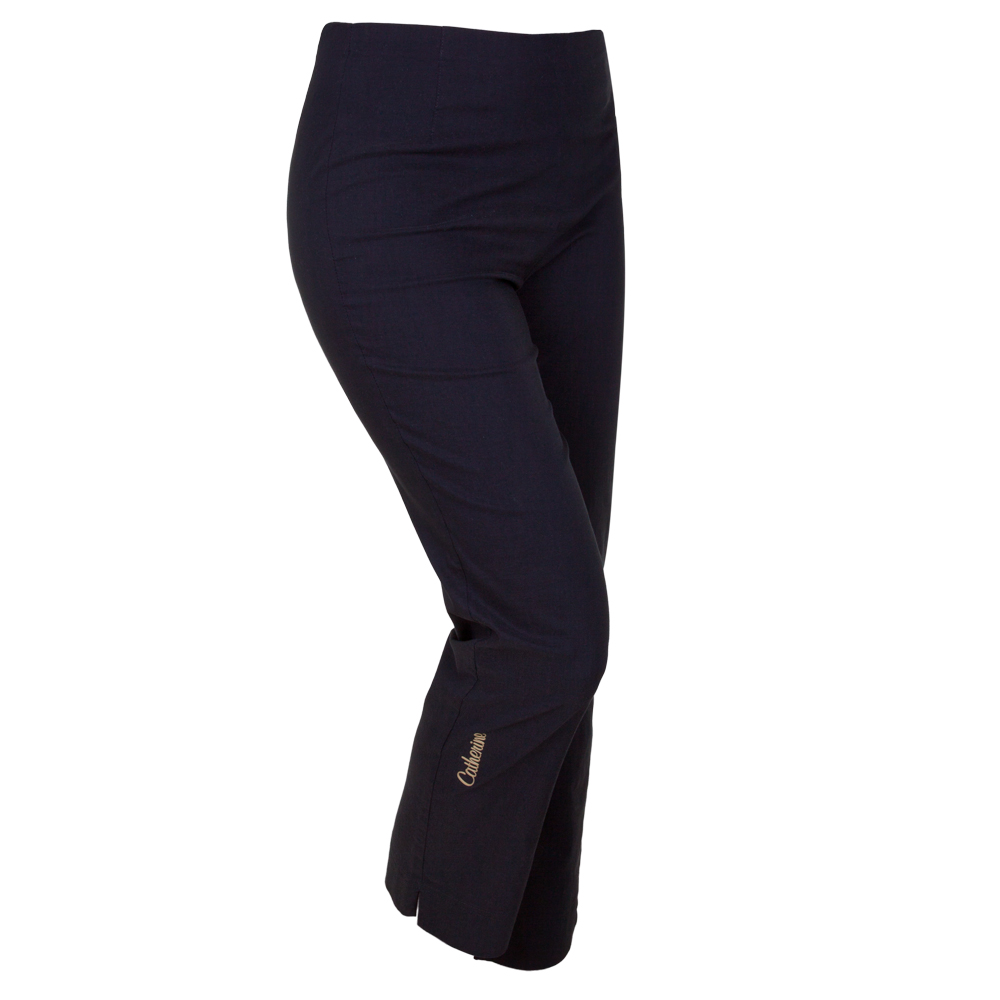 Die bequemen und eleganten Hosen sind klassisch geschnitten mit geradem Bein und Gummibund. Mit Catherine-Schriftzug in gold. Bitte beachten Sie: dieser Artikel fällt etwas größer aus. Aus 70% Baumwolle, 25% Polyamid und 5% Elasthan.