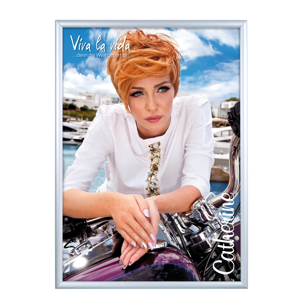 Bilderrahmen für Poster. Passend zum Format der neuen Werbeposter sind edle, silberfarbene Klappbilderrahmen in matter Optik erhältlich.
