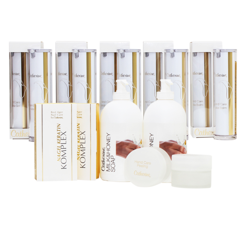 Leere Kartonagen, Spender, Tiegel und Flaschen zum Dekorieren. Enthält: je 2 leere Handpflege Spender 50 ml pro Sorte, 5 leere Kartonagen für Handpflege Spender 50 ml, 2 leere Hand Care Peeling Tiegel 50 ml, 2 leere Flaschen Milk & Honey Soap 500 ml + 2 leere Kartonagen Nagel Keratin 5 Ampullen.