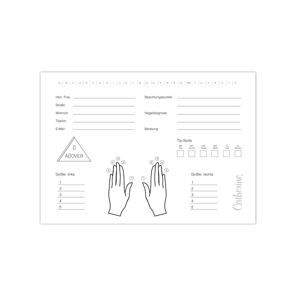 Die speziell konzipierten Kundenkarteikarten bieten einen schnellen Überblick für die Anwendung unserer ALLover Gele. Mit unseren Karteikarten behalten Sie alle wichtigen Informationen Ihrer Kunden im Blick – von den verwendeten Produkten bis hin zu individuellen Wünschen und Notizen. Optimieren Sie Ihren Service und beeindrucken Sie Ihre Kunden mit professionellem und organisiertem Arbeiten. Bestellen Sie noch heute Ihre Kundenkarteikarten und bringen Sie Ihr Studio auf das nächste Level!
