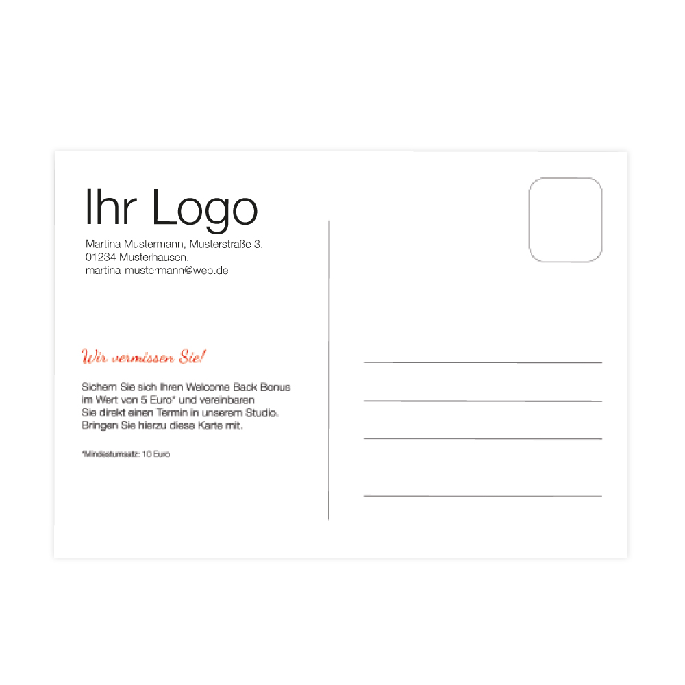 Postkarte 5 Euro Welcome Back Bonus. Nur mit Nutzungsrechten (für Fach- und Elitestudios). Informieren Sie sich noch heute, wie Sie mit Ihrem Studio ein Fach- und/oder Elitestudio werden können, um sich so die Nutzungsrechte zu sichern.
